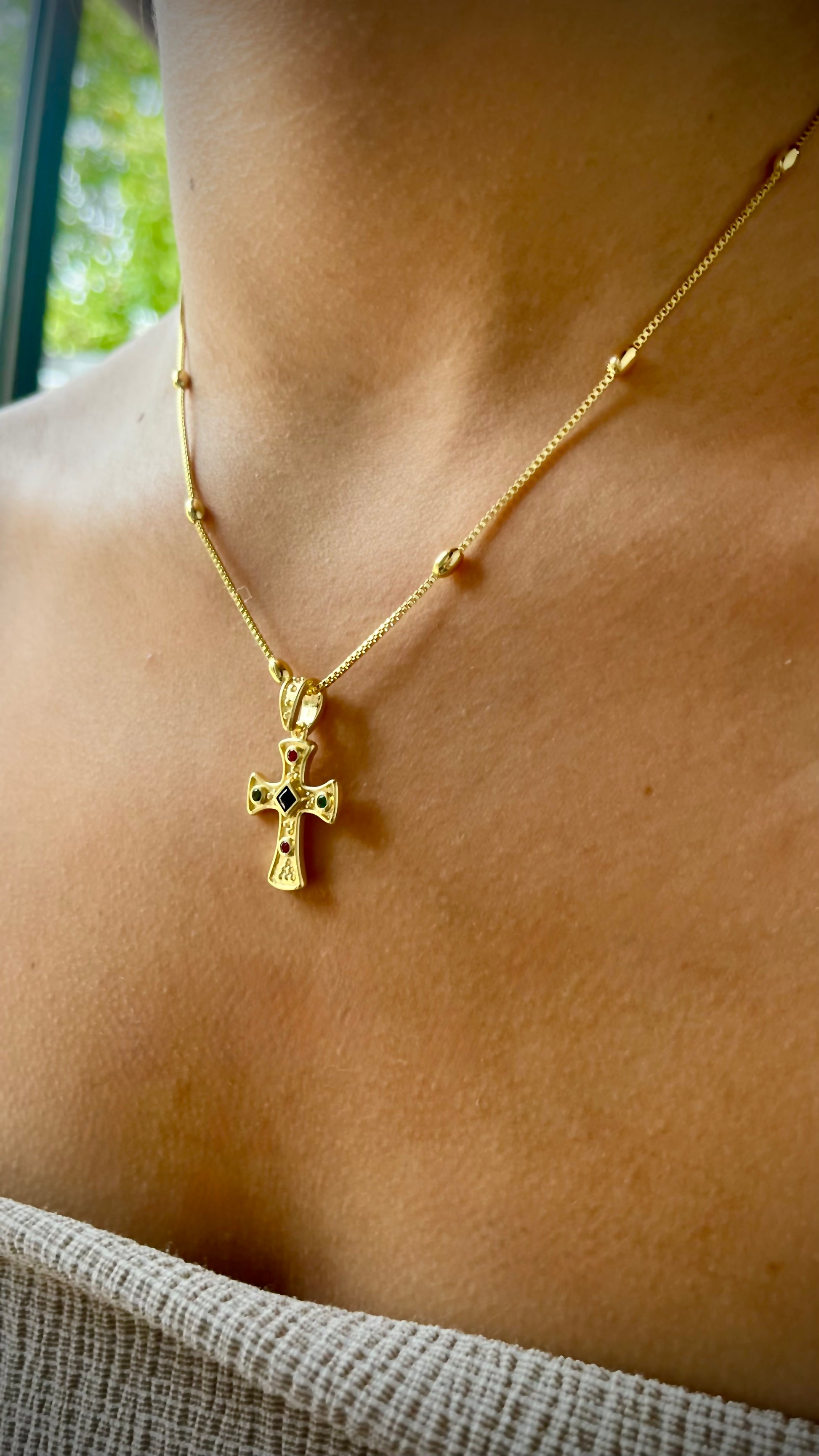 Collar de 40 cm + 5 cm de alargue, con delicadas pepitas bañadas en oro. Su dije de cruz con circones aporta un brillo especial para esta temporada, convirtiéndolo en un accesorio perfecto para cualquier ocasión.