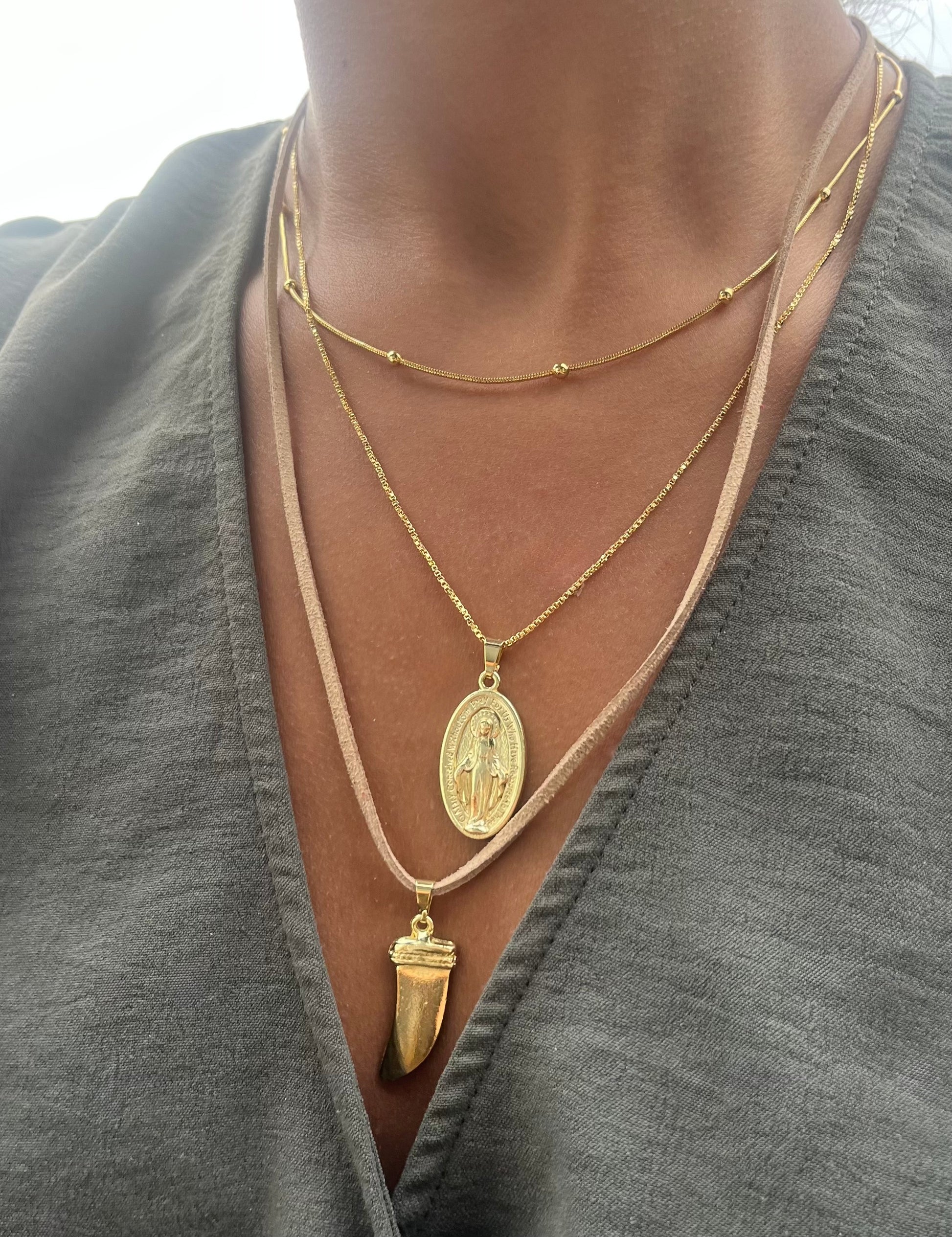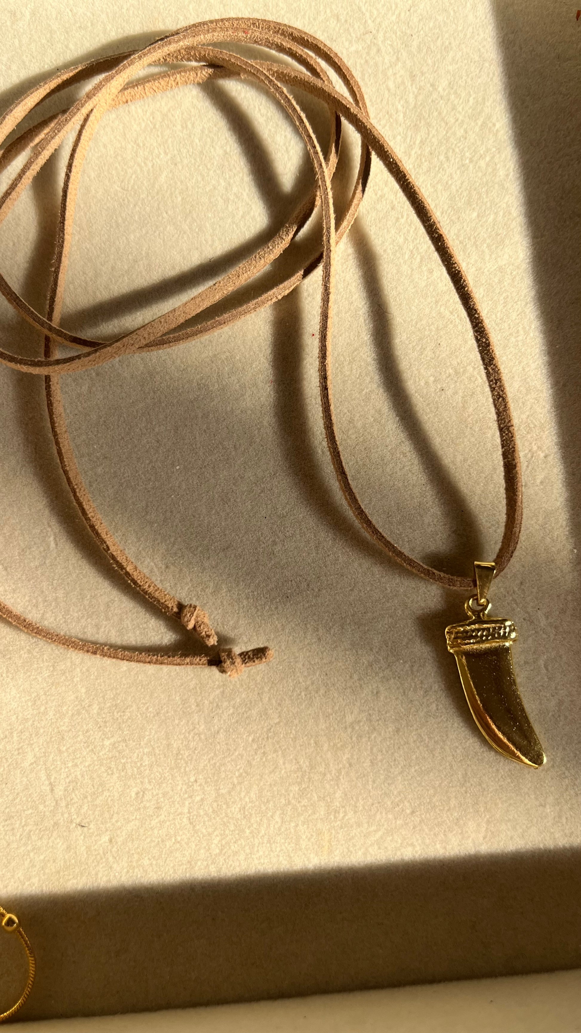 Cuero con dije de cuerno de bronce con enchape de oro de 14k.